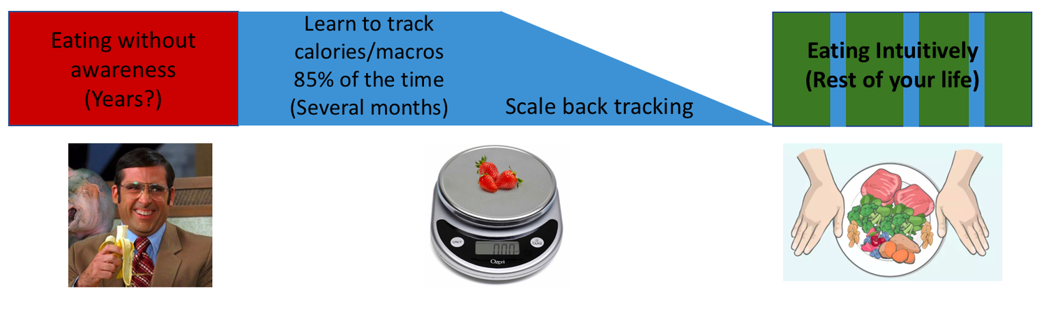 This picture basically describes what I talked about above. You enter nutrition coaching really having not thought much about what goes into your pie hole for years. Either on your own or with the guidance of a coach, you learn to figure out how to weigh and measure your food, learning what quantity of macros and what level of food quality works for you and your goals. After this learning process, you begin to scale back your tracking from 6-7 days per week, to 3-4 days, to 1-2 days. Eventually you may only track one day every month. This is a good idea simply to make sure your “mental food scale” is still pretty close to an actual food scale. For me, I know that portions will inflate over time. What I think is 6 ounces of chicken is actually 9, so taking that one day to re-calibrate my brain is important.