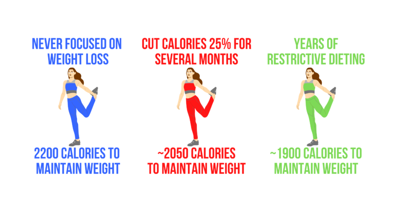However, people often come to us after long periods of eating very low amounts of calories and high amounts of restriction, but they have reached a plateau and are no longer making progress. Why? At this point, their metabolism has slowed down by up to 20%. Despite eating a small amount of food, they are no longer in a calorie deficit.